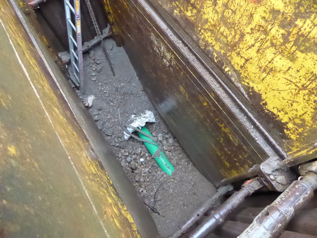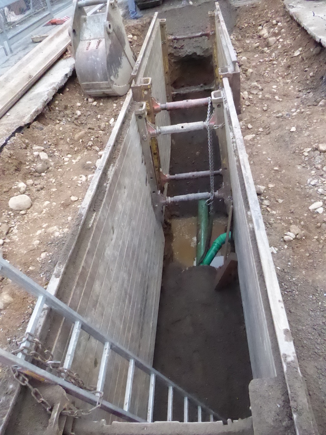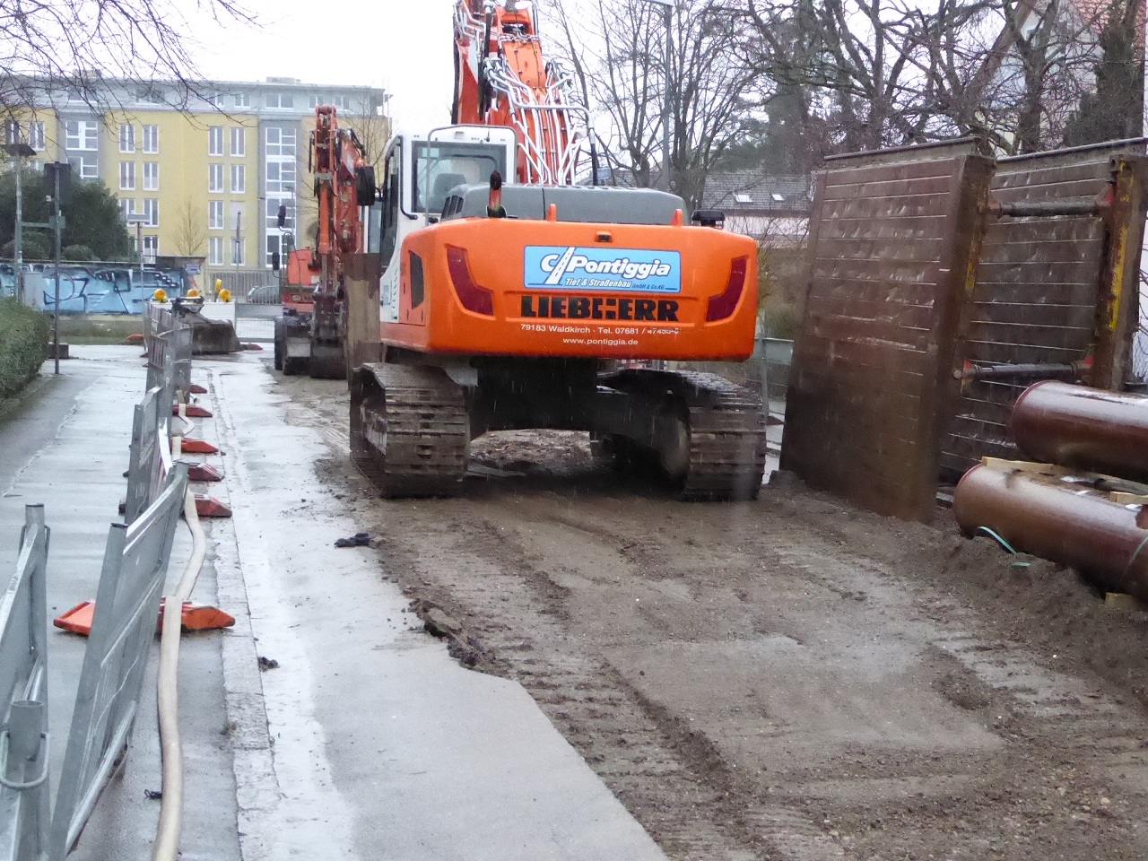 Es fällt auf, dass selbst bei der schmalen Draisstraße immer nur direkt über dem Kanal aufgegraben wird. Der Grund ist, dass die Schnittkanten im Asphalt zwangsläufig durch die Baufahrzeuge brechen. Die Straßen werden daher zuerst mit provisorischen Asphalt geschlossen und in einem zweiten Schritt nach dem Kanalbau auf der ganzen Breite neu asphaltiert. Eine Freiburger Besonderheit ist, dass die Stadtentwässerung nur für den Kanal und die Anschlussstücke zuständig ist. Vom Kanal bis zur Grundstücksgrenze sind die Grundstücksbesitzer verantwortlich. Bei der Aufgrabung ist immer ein Kampfmittel-Experte dabei, da der West-Stühlinger im Krieg stark von Bomben getroffen wurde. Er schaut auf die Baggerschaufel und leitet bei einem Munitionsfund Sperrungen in die Wege. Da der Bypass nicht die volle Wassermenge wie der Kanal aufnehmen kann, können die Kanalbauer bei starkem Regen nicht in der Baugrube arbeiten. Diese läuft dann mit Regenwasser voll.
