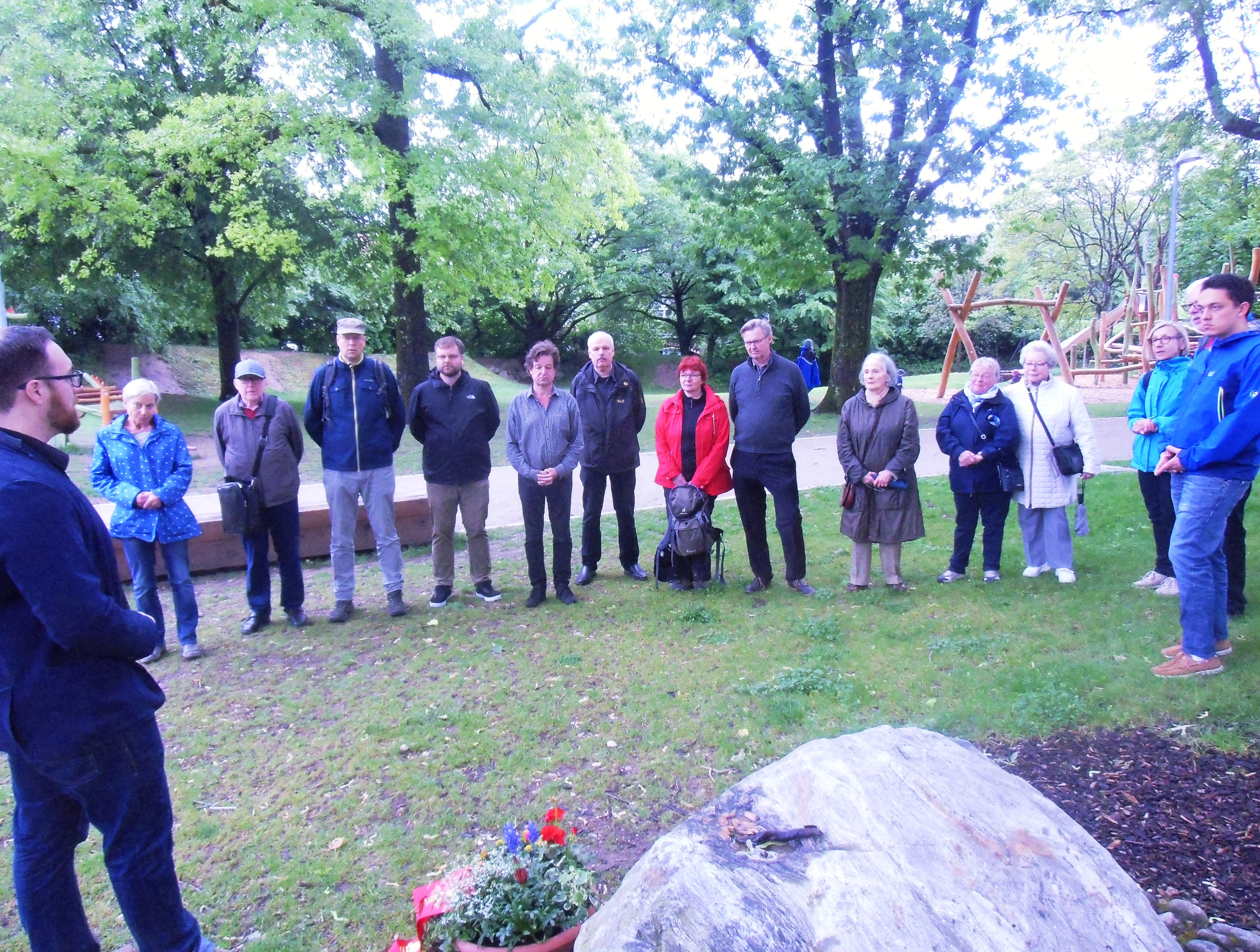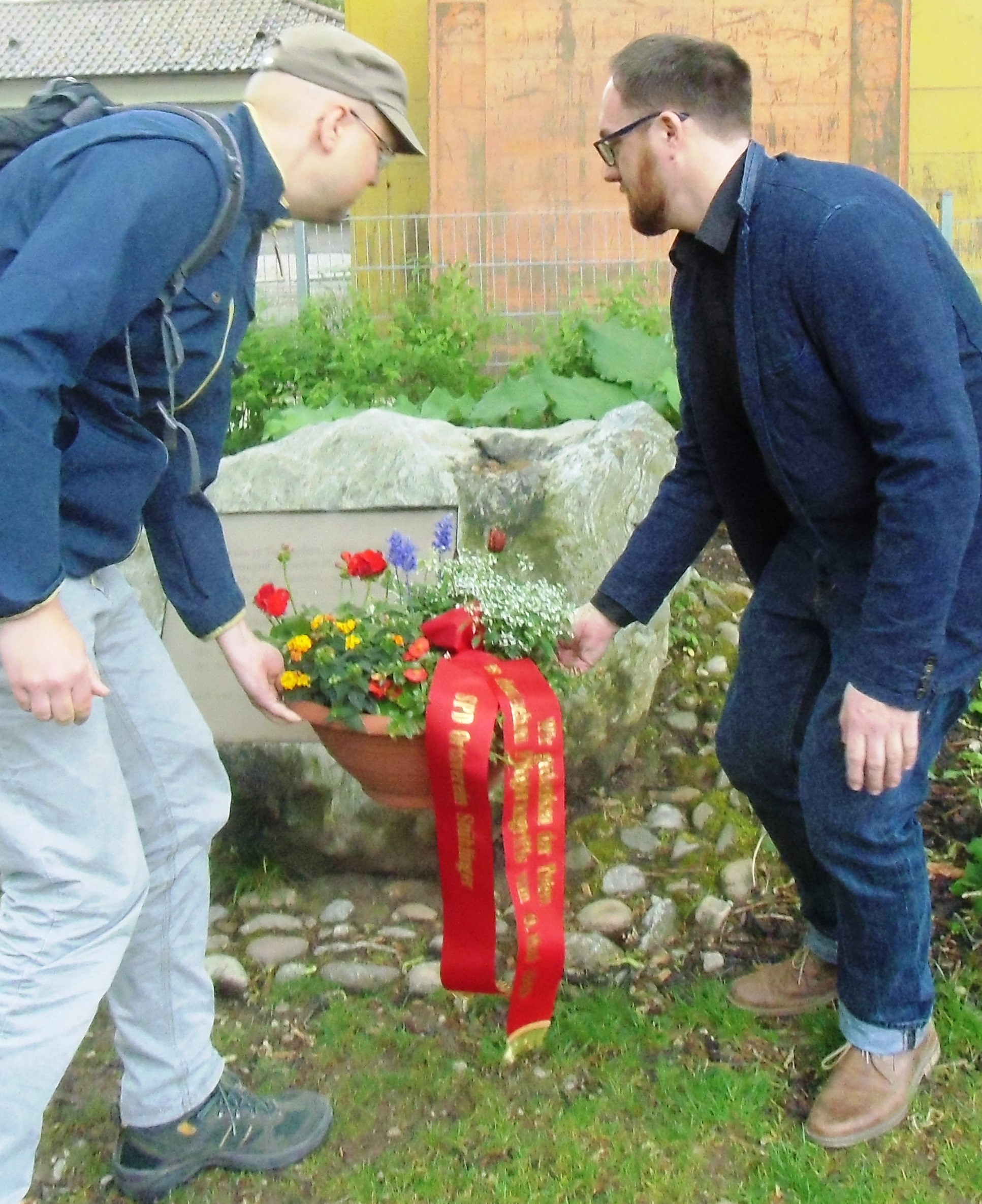 Im Anschluss an die Ansprache legten der Ortsvereinsvorsitzende Uwe Stöhr und sein Stellvertreter Philipp Kolb gemeinsam auf dem Gedenkstein ein Blumengebinde nieder. Anschließend gedachten sie gemeinsam mit den anwesenden Teilnehmern der 57 Toten vom 10. Mai 1940.